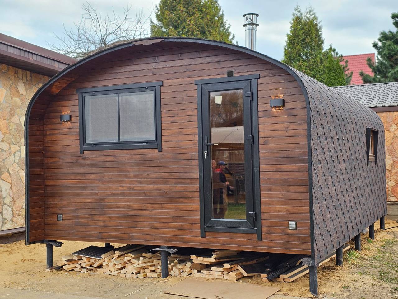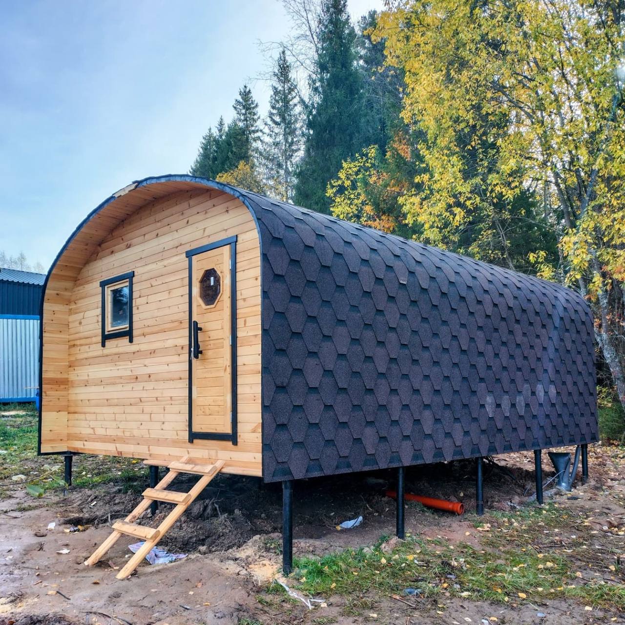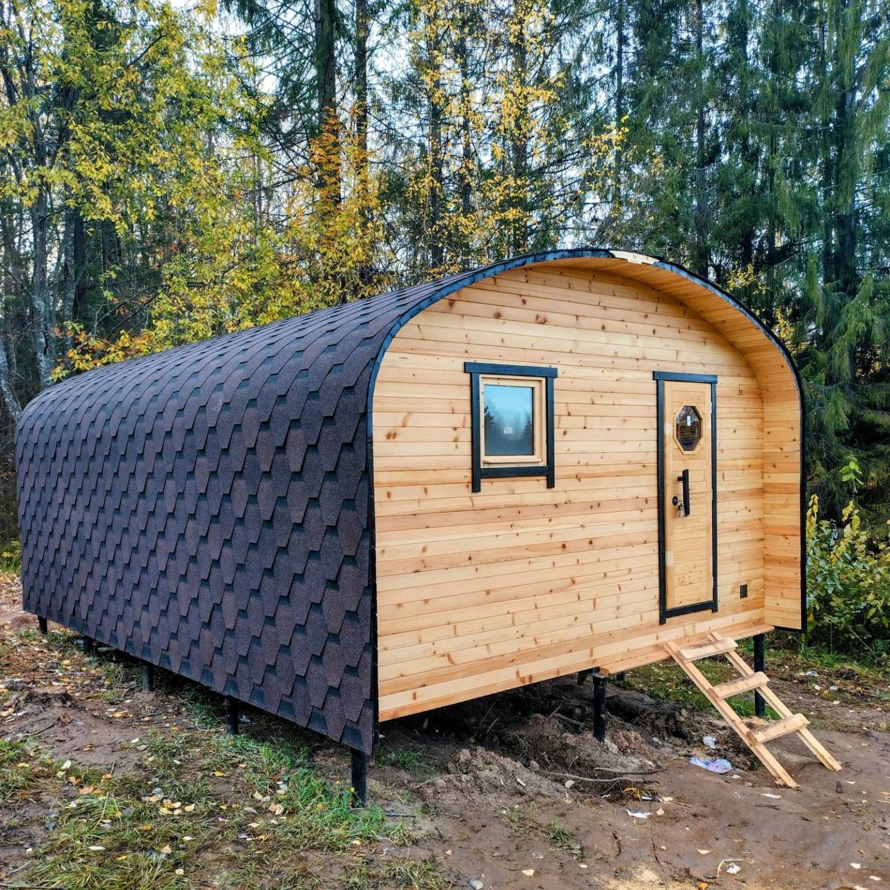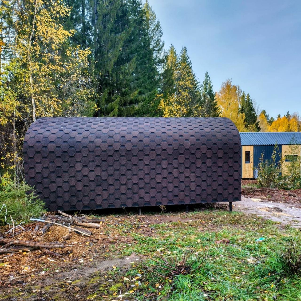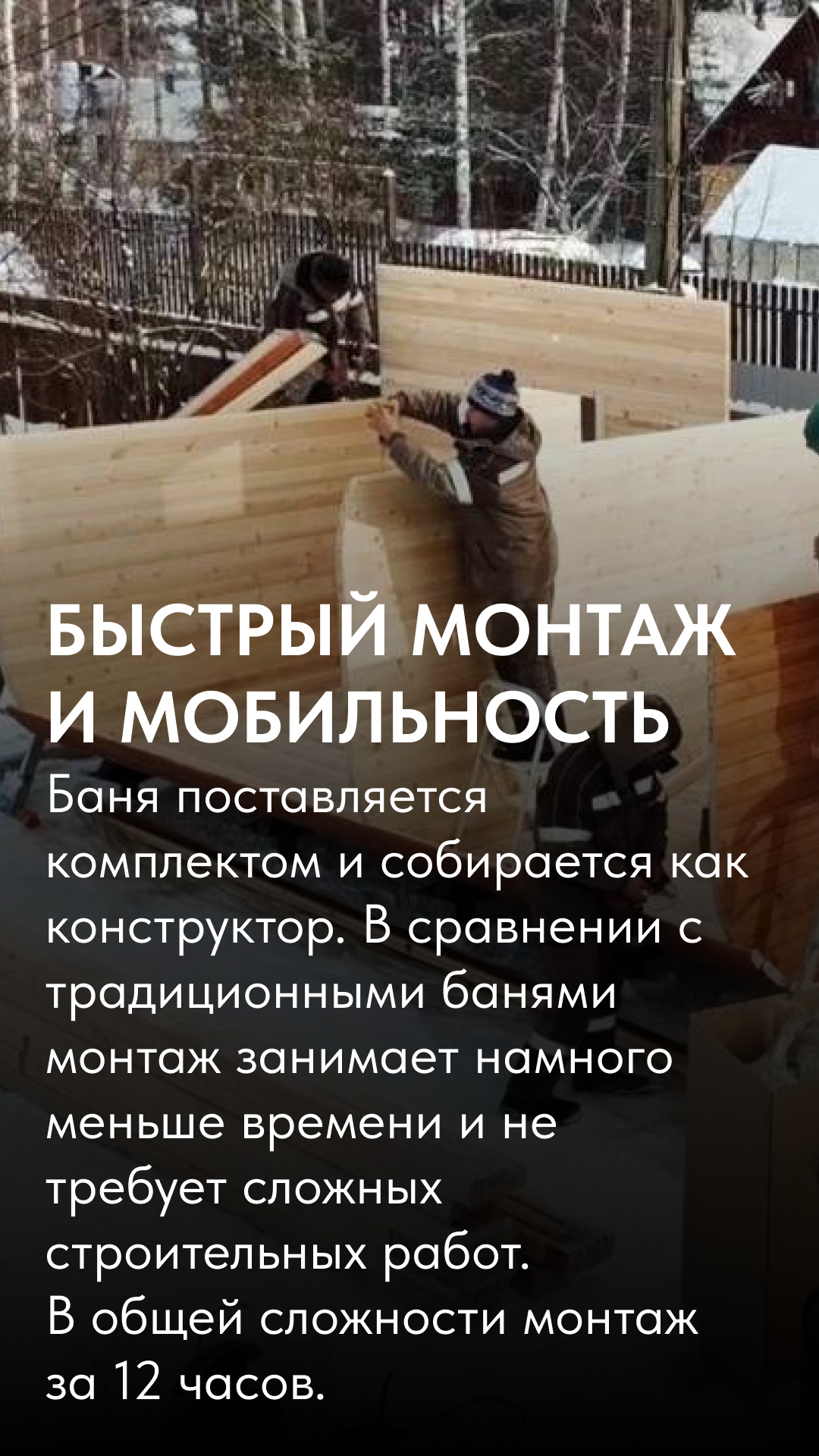 Строить месяцами — значит терять деньги, нервы и сезон. Наши бани собираются на собственном производстве, доставляются готовыми и устанавливаются за один день. Без фундамента, долгостроя и без бригад, живущих на участке. Утром пустой двор — вечером готовая баня.